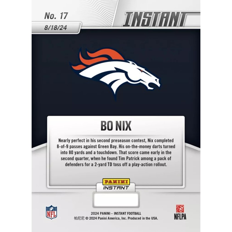 This is a rare opportunity to own a graded 10 Bo Nix #17 RC Rookie Card from the 2024 Panini Instant set. This valuable sports trading card features the talented football player from the Denver Broncos team. The card is perfect for collectors and fans of the NFL league. With its unique design and high-quality printing, this card is a must-have for any serious collector. The card is unautographed, but its rarity and excellent grading make it a highly sought-after item. Don't miss your chance to add this impressive card to your collection.