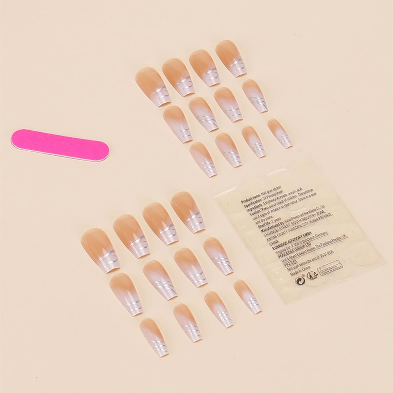 Gradient French Press on Nails Medium Length Aritifical Square Fake Nails Silver Stripes Design Arcylic False Nails Full Cover Reusable Coffin Nails Nature Fit Stick on Nails Glue on Nails for Women