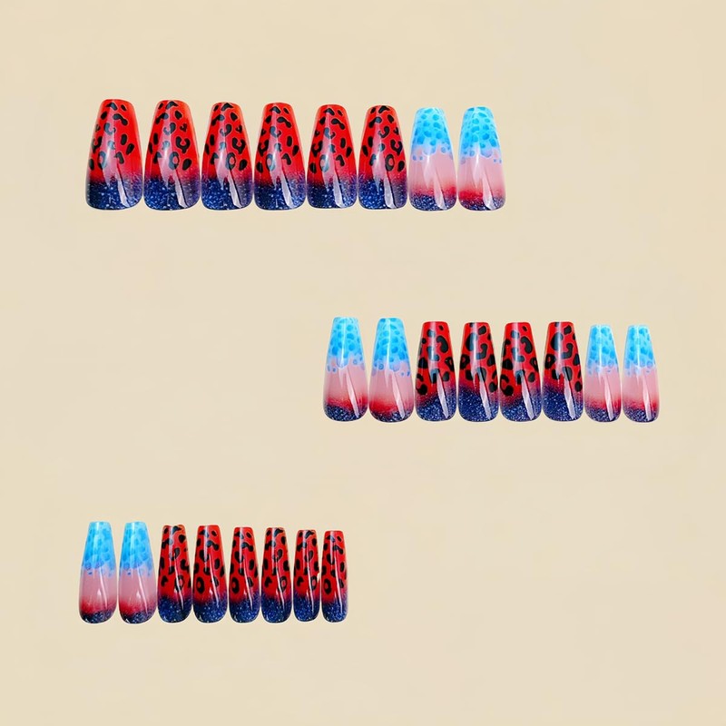 Gradient Press on Nails Medium Coffin Fake Nails Blue and Red French Tip Acrylic False Nail with Leopard Print Designs Full Cover Glossy Stick on Nails Daily DIY Manicure for Women 24Pcs