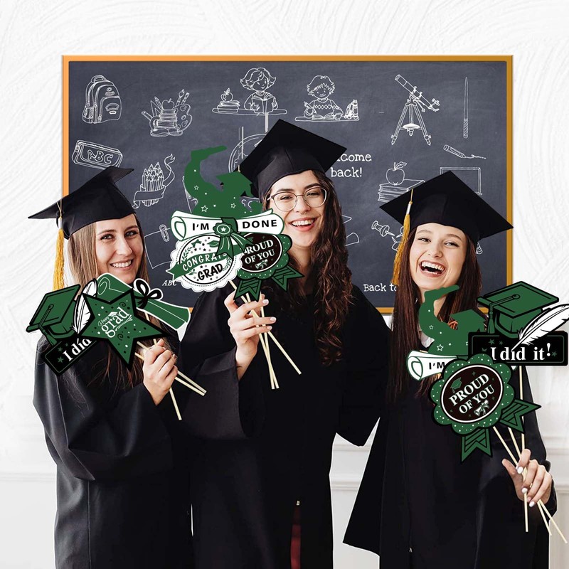 - You will get 24pcs Green Black graduation sticks including : congrats grad, you did it,proud of you,I'm done,happy grad.The unique and delicate shape of the graduation cap, star and graduation diploma, perfect for Green Black graduation party table decorations