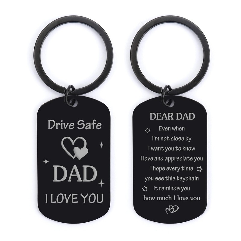 - Drive Safe Dad Keychain: Both sides are engraved with warming words. On the front it says “Dear dad, even when I'm not close by, I want you to kno I love and appreciate you. I hope every time you see this keychain, it reminds you how much I love you", and on the back it says "Drive Safe DAD. I love you". Engraved keychain is a unique ‘love letter’ that can be carried anywhere to show your dad love and appreciation