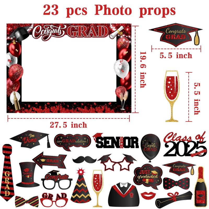 - 【GRADUATION PHOTO BOOTH PROPS】Do you want to have a different kind of unforgettable graduation memory in 2025?Do you want to leave cute and funny pictures at class of 2025 party?These bling black and red grad photo props are perfect for you!