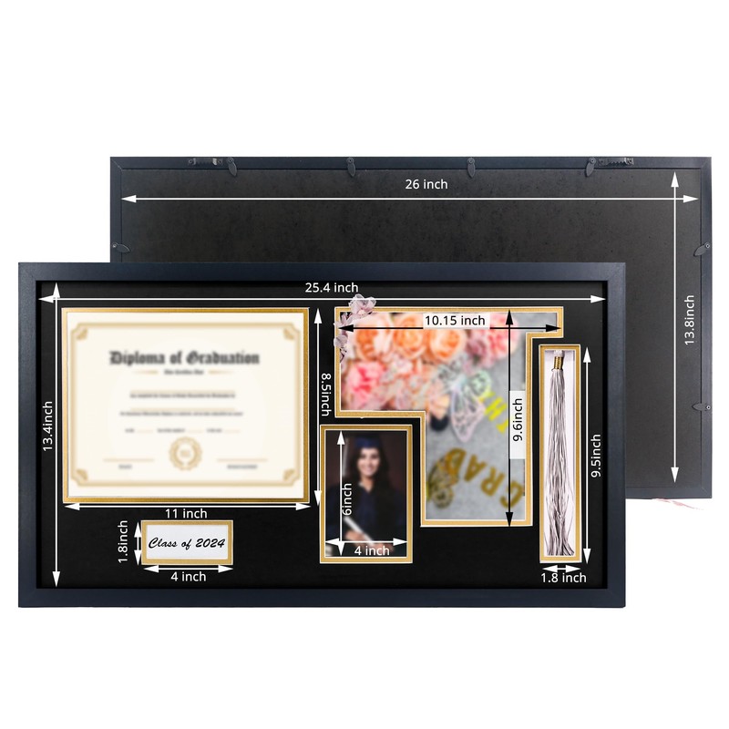 - 【SIZE】The overall size for this frame is 15x27x1.3 inches. The opennig size for certificate is 8x11 inches, for picture is 4x6 inches, for cap is 9.6x9.6 inches and for tassel is 1.8x9.5 inches.