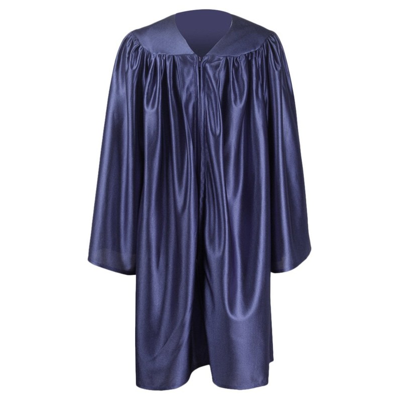 - Gown: 100% shiny polyester, zipper opening, neck and pleat piping
