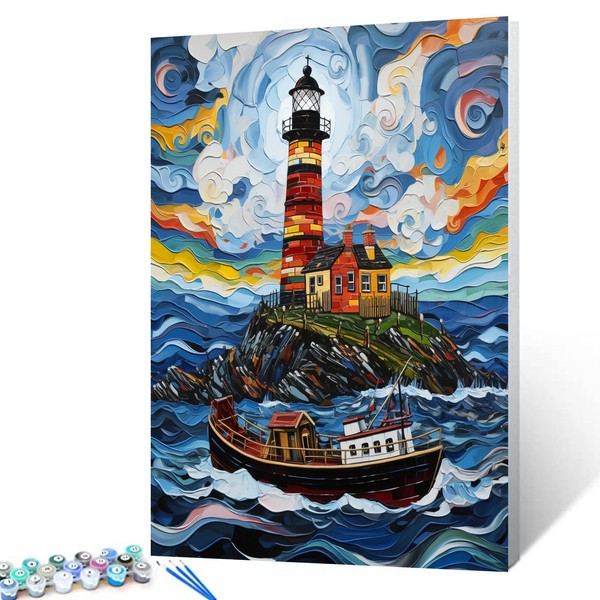 Graffitic Seascape DIY Paint by Numbers for Adults Sailing Boat DIY Oil Painting Acrylic Paint Art Painting Kits Lighthouse House Canvas with Acrylic Paint 16x20 Inch Home Decor Gift(Frameless )