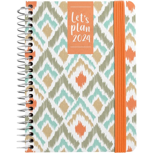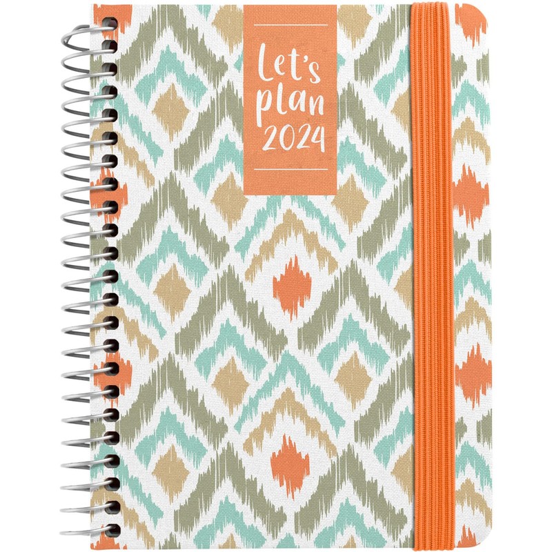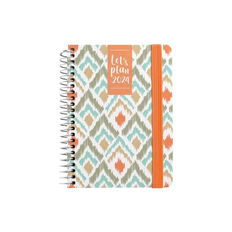 - 2024 Day to a Page Diary with Blurred Orange from the Grafoplás "Design" series of planners, fabric lined hardcover with green rhombus print, earth and orange details, rounded corners and metallic spiral binding
