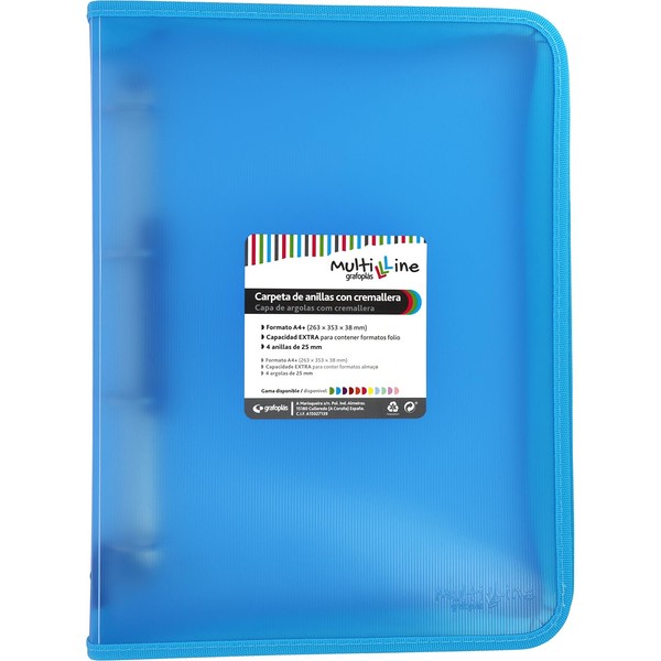 Grafoplás Ring Binder with Zip A4+, Light Blue, Multiline, 4 Mixed Rings 25 mm, Vertical Ruled Polypropylene Cover, Extra Capacity for Sheets of Paper, Folio Format