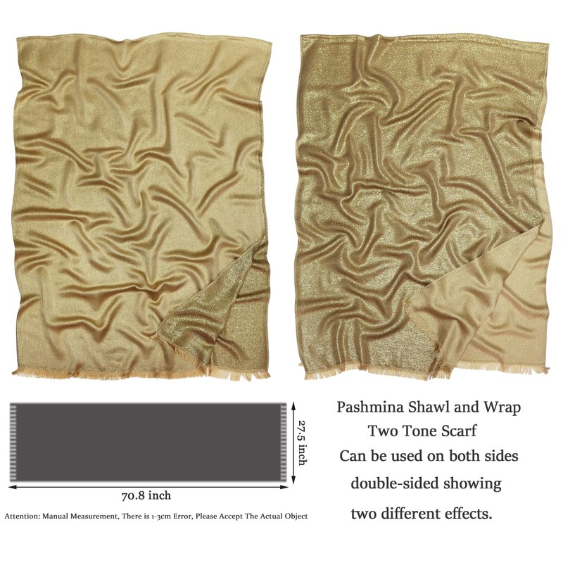 - Shimmer Material - Shawls and wraps for evening dresses is made of 50% pashmina and 50% polyester (metallic fiber.) Feel that soft, cozy, comfortable and non itch. Two tone scarf double-sided showing two different effects.