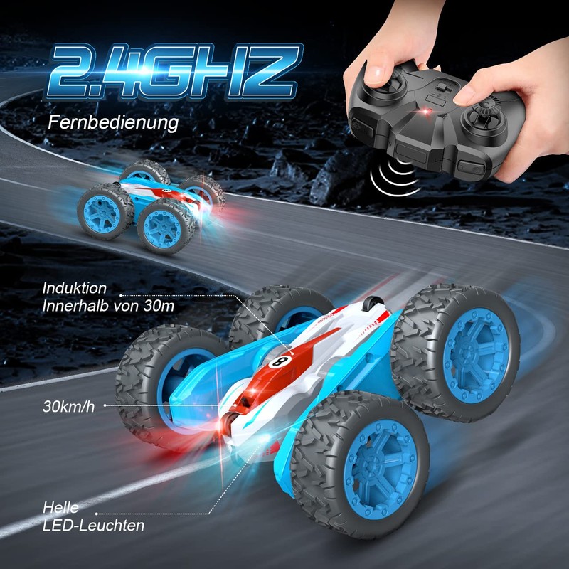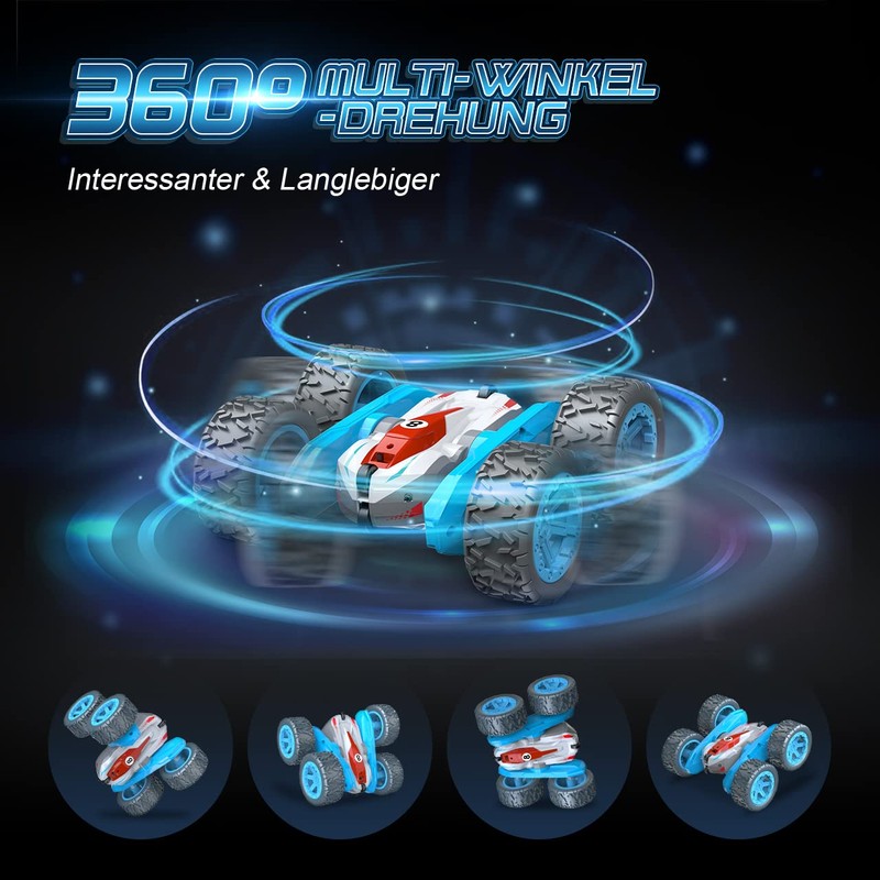 - 360° rotating stunts: this remote controlled car can be rotated 360 degrees and drives on both sides. The automatic mode ensures a unique gaming experience. With LED lighting for even more excitement and fun during night races.
