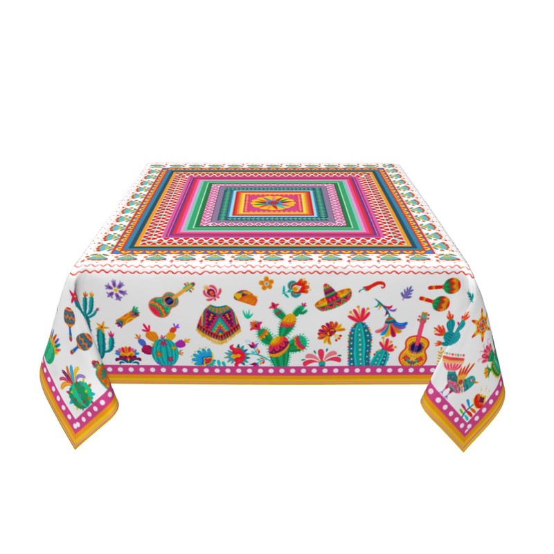 - Tamaño: tamaño cuadrado de 54 x 54 pulgadas. Mantel cuadrado mexicano, estampado por un lado, no se decolora y brillante, adecuado para pequeñas mesas de decoración.