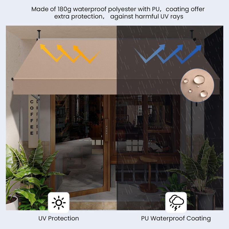 - 【Sunshade and Privacy】: This patio awning offers UV sun protection and will save you from the strong ultraviolet light. Our manual retractable awning is made of premium polyester fabric with excellent UV resistance. Besides, it also has excellent PU waterproof function. If it gets dirty, it's easy to clean.
