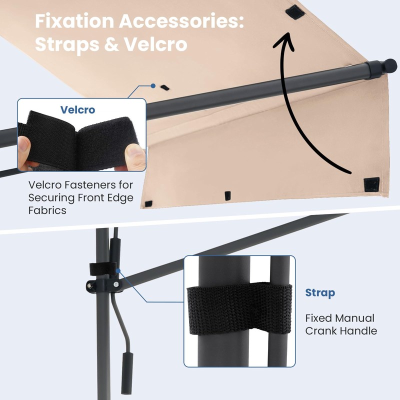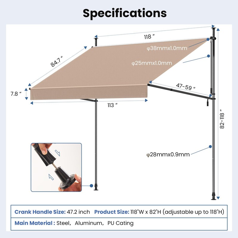 - 【Easy Adjustment】: The retractable awning support poles can be adjusted in height from 82"-118" with crank handle to fit different door and window heights. The length of the side pole is adjustable in three levels (47"~53"~59"). The angle of the awning can be adjusted from 0° to 90° to match various shelter needs. No drilling is required for extra convenience.