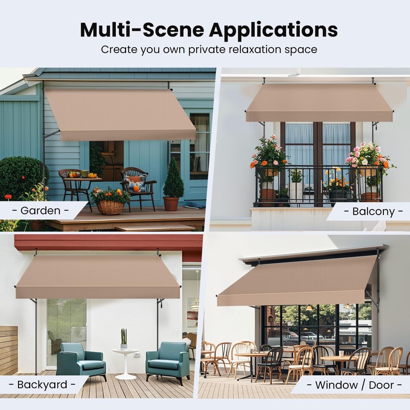 - 【Versatile Use】: The Manual Retractable Awning can be used in your patio, garden, balcony and windows. It will provide a cool room and protect from a rainy weather to create a comfortable and private space for your outdoor leisure.