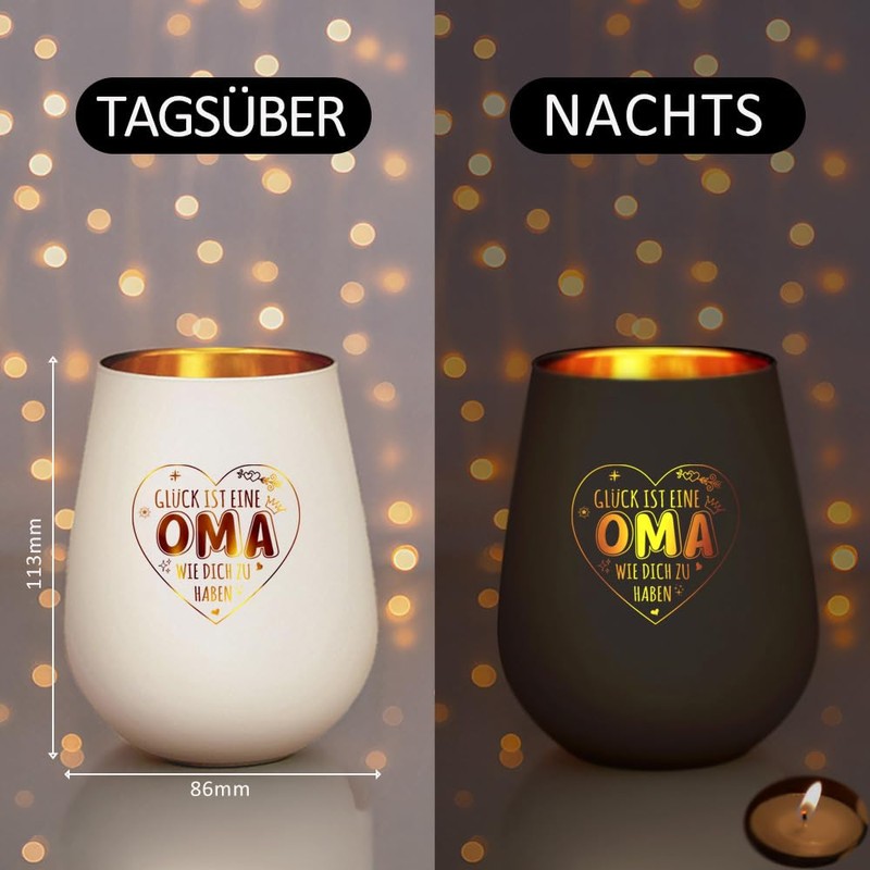 - Made of high-quality glass, with engraving skeleton texts "Glück ist ein Oma wie Dich" ("Happiness is a grandma like you") Size: 113 x 86 x 86 mm. (Please note: candle not included in the package)