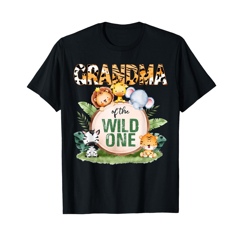 - Grandma of the Wild One Zoo Safari Birthday Party T Shirt featuring a the phrase Grandma of the Wild One with a Lion, Giraffe, Elephant, zebra and Elephants, Crocodiles, leopard. Check out our brand for more kids and toddlers Zoo themed birthday party