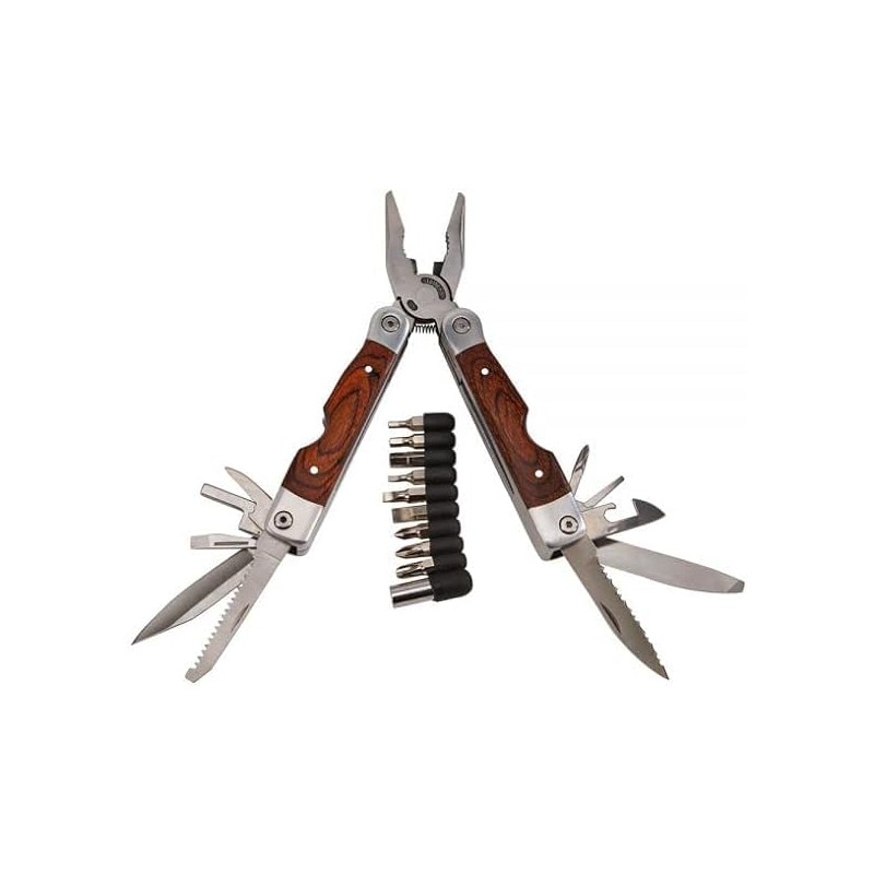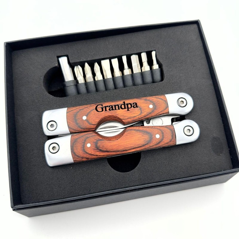Grandpa multi tool set has it all: knife blades, bottle opener, saw, file, Phillips head and flat head screwdrivers, 7' pliers, and 9 screw bits. The entire set is delivered in a presentation gift box along with a belt pouch. This is one gift he will not forget! Great gift for Father's Day, Birthday or Christmas.