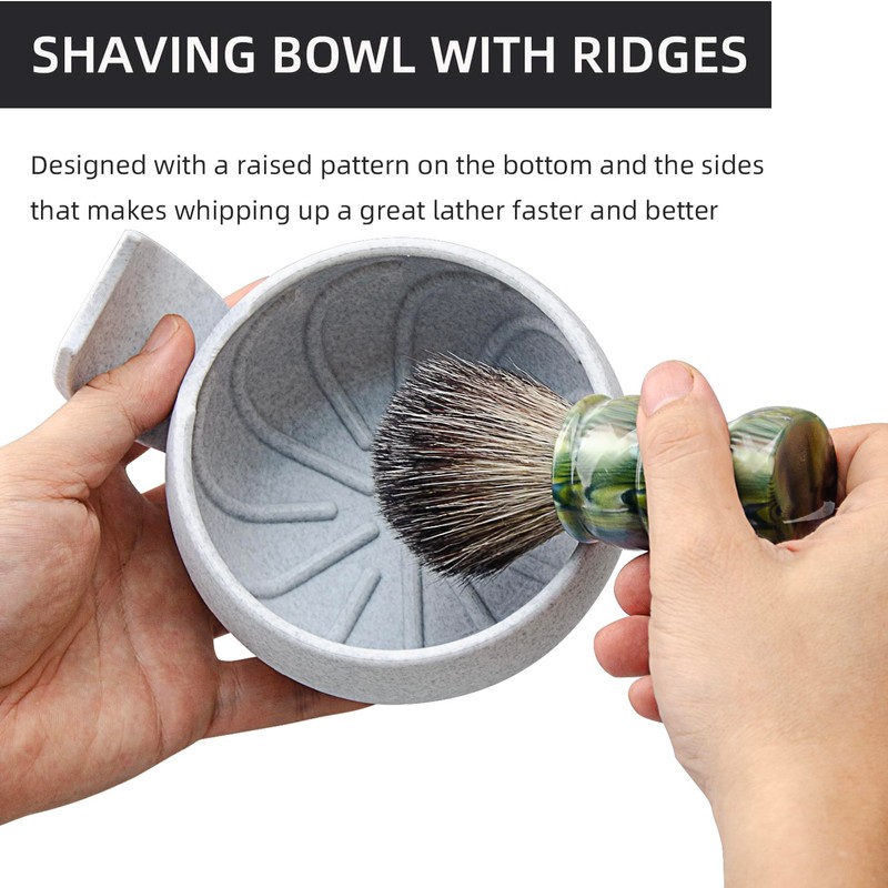 • Package Includes: 1 x Shaving Brush1 x Shaving Bowl with a practical shave brush rest for easy brush storage.Designed for the convenience of those that use a shave brush, the unique shave mug offers a fucntion brush rest on top of the handly and and sturdy construction.