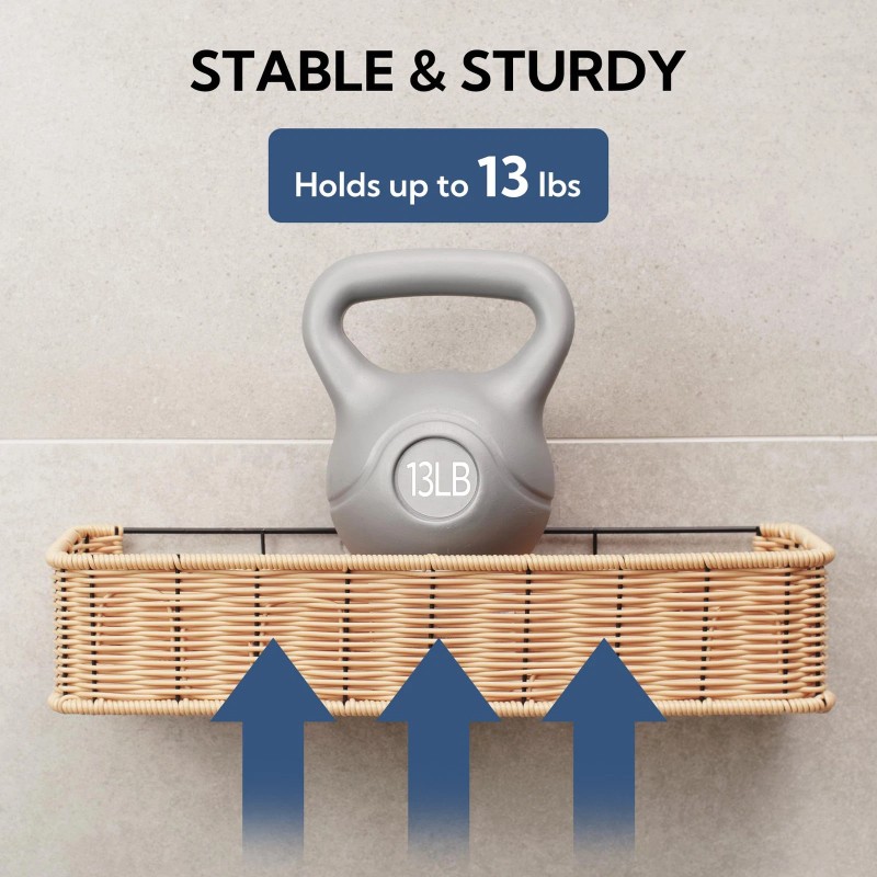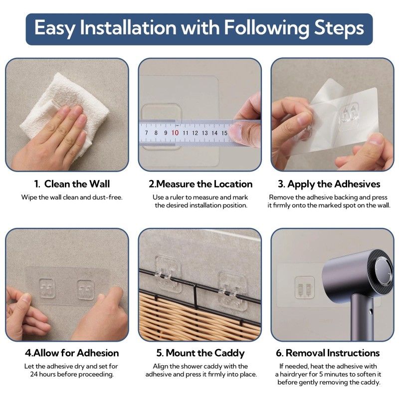 Strong Adhesive & Easy Installation: Comes with 4 mighty adhesives that can hold up to 18lbs, making the shower racks stable and steady. Additionally, our wall-mounted shower baskets offer simple, no-drilling installation in minutes with included instructions, allowing for quick usage. Note: Heat the surface of the adhesives with a hairdryer for 5 minutes to remove them if needed.