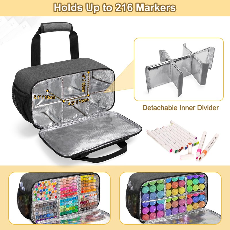 - LARGE CAPACITY: Features a detachable partition with hollow panels; Divide the main compartment into six parts (Inner dimension of each parts:4.3”x5.1”x4”); Whole marker bag can accommodate up to 216 markers; Note the markers' length not exceed 5.1"/13 cm