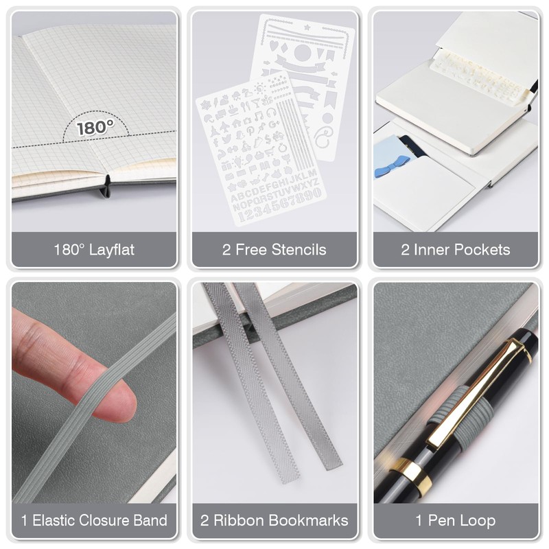 • 【Thoughtful Accessories】Complete with practical accessories, each grid notebooks includes 2 pockets, 2 bookmark ribbons, 1 elastic band, and 1 pen loop. Additionally, each set comes with 2 free grid journal notebook stencils featuring various graphics, letters, and numbers, enhancing creative possibilities for planning, documenting work, or artistic endeavors.