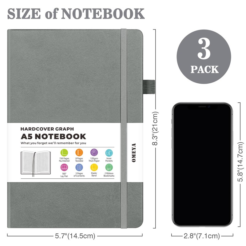 • 【3 Pack Graphing Notebook】This leather notebook bulk includes 3 notebooks and 2 stencils, offering great value for money. Each notebook grid contains 80 sheets (160 pages) , totaling 240 sheets(480 pages) across the set. The sturdy binding design guarantees the pages remain secure and will not easily come loose. Sized at a large A5 size(5.7"x 8.3"), these grid journals offer a balance between portability and ample space for notes.