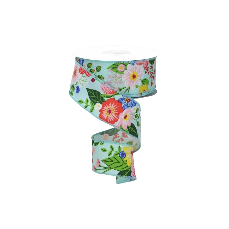 Graphic Florals Flower Pattern Wired Edge Ribbon for Fabric Bows, Wreaths, Garlands, Gift Wrap, Baskets, Arrangements, Crafts and Decorations, 1.5" Wide x 10 Yards, Aqua Light Blue, Green, Pink, Multi