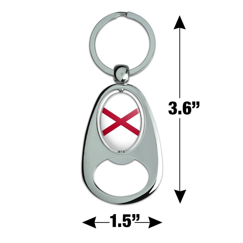 This Alabama State Flag keychain will impress your friends with its premium bottle cap opener! This keychain is made of chrome plated metal with the printed and resin-topped design on both sides of the center spinning oval. The size of the keychain is approximately 3.6" (9.1cm) in height and 1.5" (3.8cm) in width.