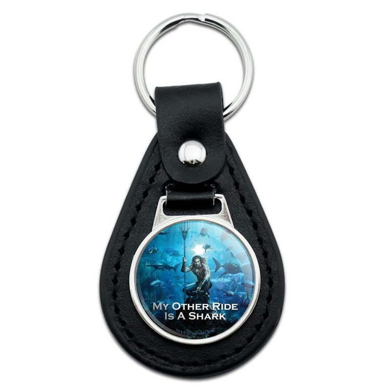 - DURABLE RESIN-TOPPED DESIGN - This Aquaman Movie My Other Ride is a Shark leather and metal key chain features the Aquaman Movie My Other Ride is a Shark design shown encased in resin, and mounted on a nice black leather backing.