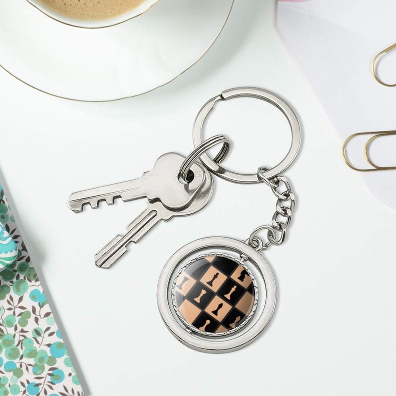 Chess Board Pieces Pattern keychain will help you make a statement with this truly unique keychain! The center circle with the cool design shown spins completely around. The keychain is chrome plated metal and double-sided with the resin-topped design. The round part of the keychain is approximately 1.3" (3.3cm) in diameter. Sold individually.