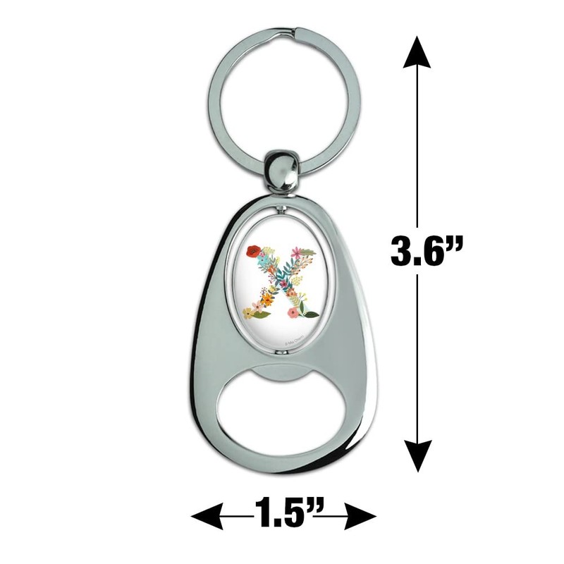 This Letter X Floral Monogram Initial keychain will impress your friends with its premium bottle cap opener! This keychain is made of chrome plated metal with the printed and resin-topped design on both sides of the center spinning oval. The size of the keychain is approximately 3.6" (9.1cm) in height and 1.5" (3.8cm) in width.