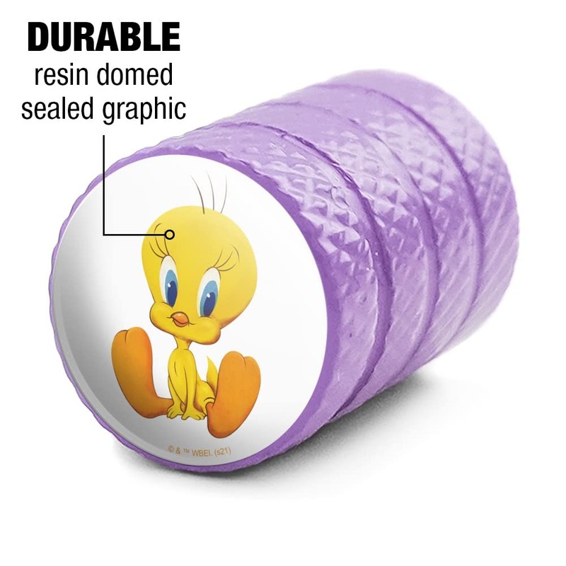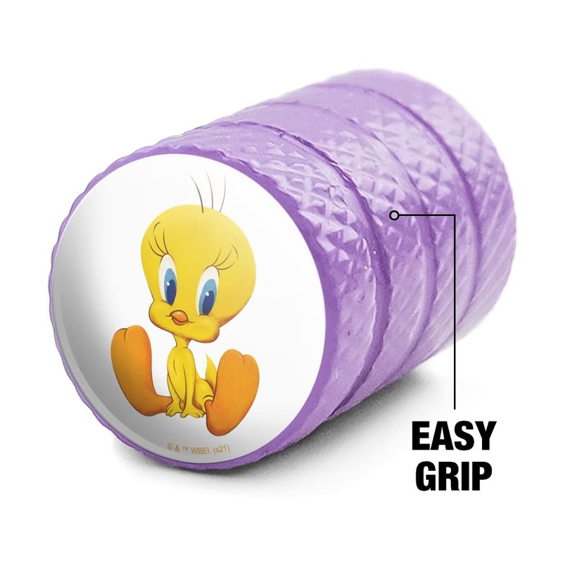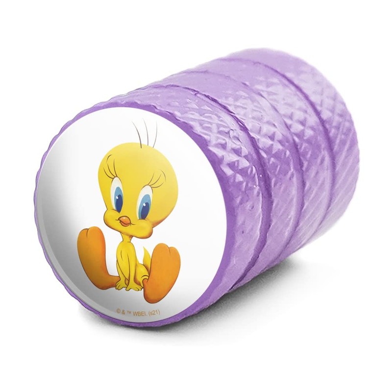 These Looney Tunes Cute Tweety valve stem caps are high-quality unique and will add a fun and a stylish look to your rims! Each valve stem cap is approximately 0.55" (14mm) in height and includes an inserted rubber o-ring for an air-tight fit.