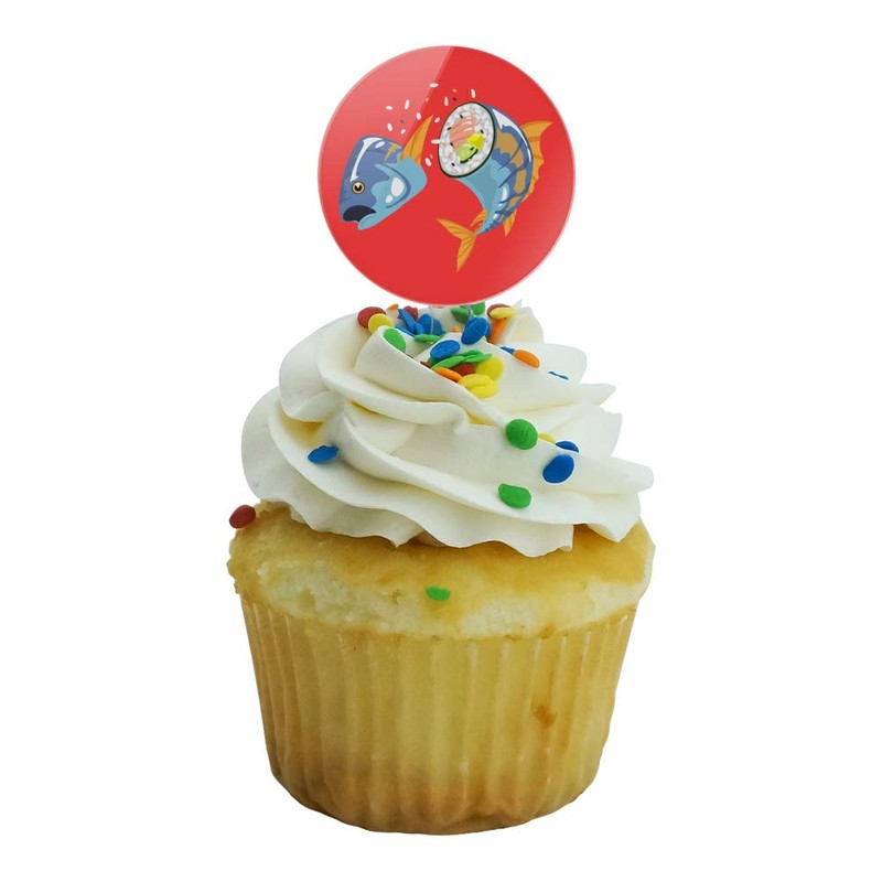 - The featured design is 1.5" (3.8cm) in diameter and is printed on food-safe acrylic. Including the zany, squiggle-shaped pick, each topper is 3.5" (8.9cm) in total height.