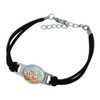 This charming, dainty bracelet with the resin-topped design shown is the perfect accessory to wear with anything from t-shirts to your favorite Friday night outfit. The bracelet is approximately 9" in length, and is made of colored suede/leather and plated metal.