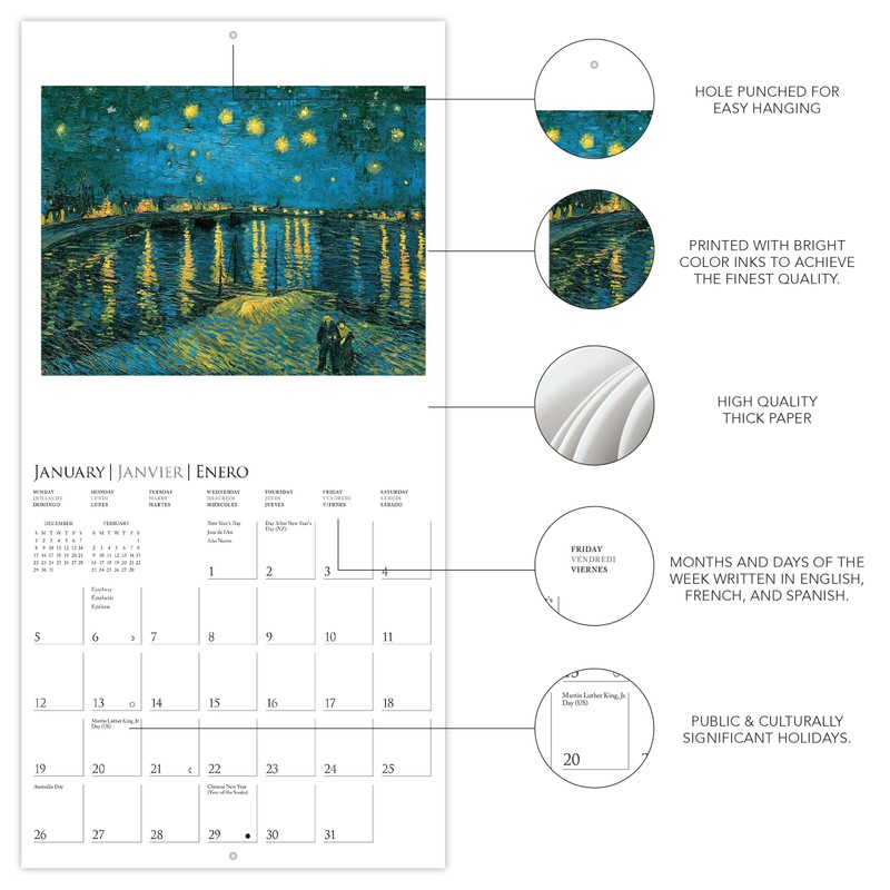 - YEARLY ORGANIZATION Calendars are a home and office essential. Keep track of monthly reminders, important dates, and events with each sizable daily grid. Every page includes before and after preview months plus public and culturally significant holidays. Months and days of the week are written in English, French, and Spanish.