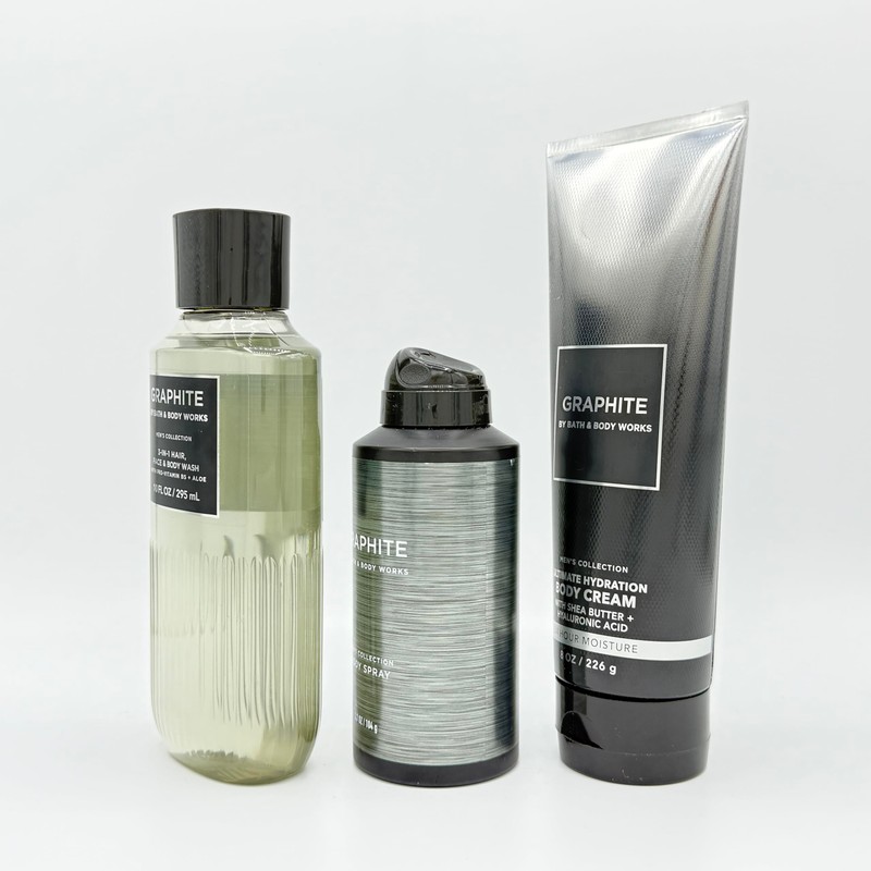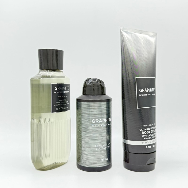 - Graphite Men's 3-Piece Bath Bundle | Body Wash, Body Spray and Ultimate Hydration Body Cream.