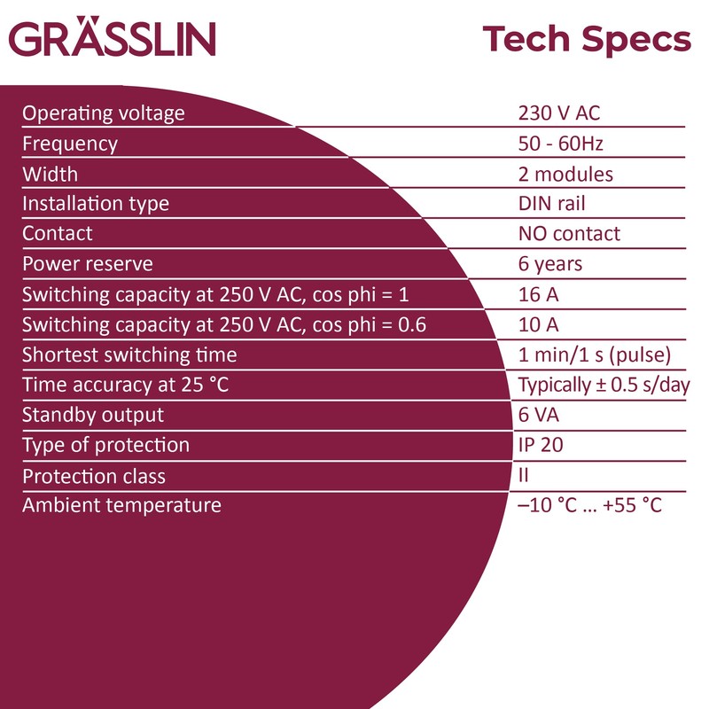 - Operating voltage 240 V AC; frequency 50-60 Hz; width 2TE; mounting on DIN rail, protection class II; IP 20; at an ambient temperature of -15 °C to +55 °C