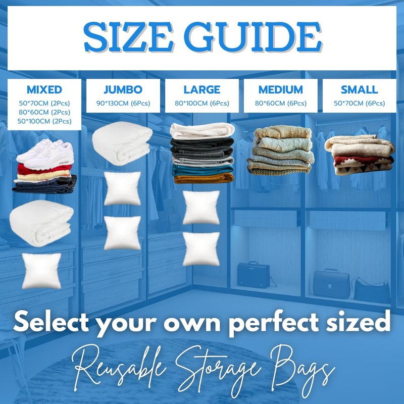 • YOU WILL RECEIVE: 6 PREMIUM QUALITY sealed bags in 3 different sizes: 2 X Jumbo Size (100 x 80 cm), 2 x XL Size (80 x 60 cm) and 2 x Medium (70 x 50 cm). The jumbo can be used for larger items such as duvets, throws and pillows. Medium size can be used for travel suitcases so that you can carry more clothes. Medium size can be used for storing your off season clothes in your cupboard.