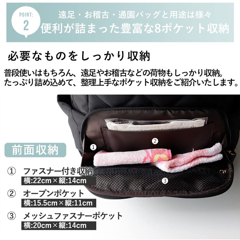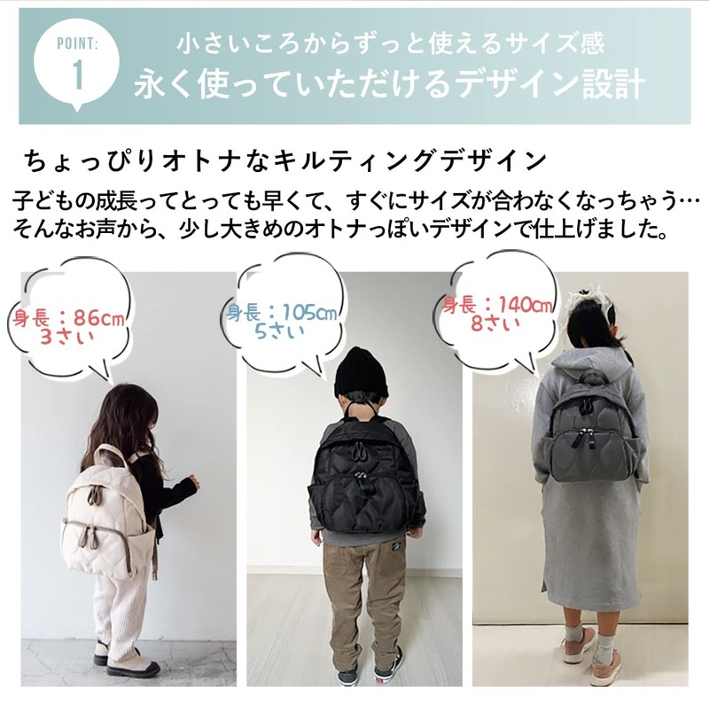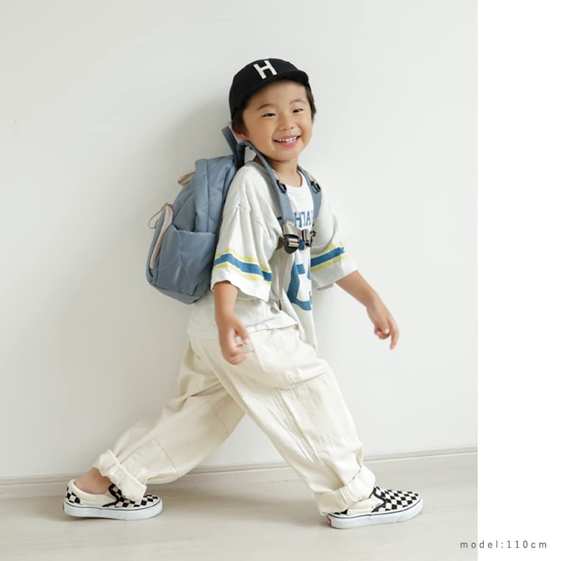 - Parents and children can enjoy coordinating links. This kids' backpack has a wide range of storage. How about a backpack with a slightly mature design that can be used for a long time? Made with high density nylon quilting, this product is both water-repellent and is extremely lightweight at about 12.5 oz (370 g). We have a total of 8 pockets and plenty of storage for kids who grow quickly. Comes with a chest strap to prevent slipping, and the shoulder part has a D-ring that can be attached to a security alarm etc. In addition, there is a name case on the inside, so you can have a bag that is safe even when it is lost or lost