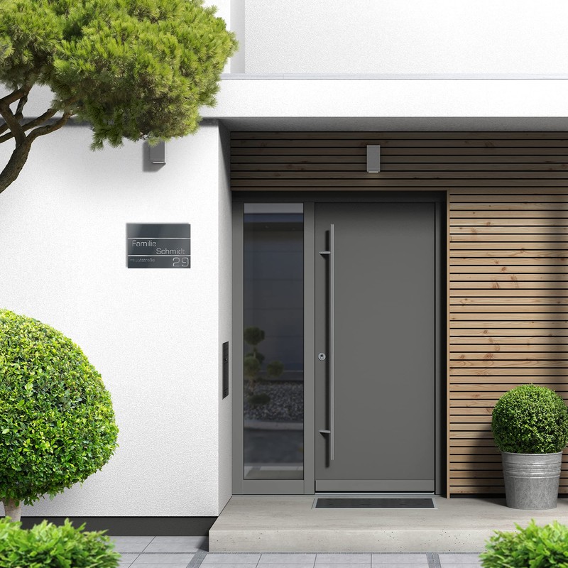 - Eye-catcher: this door sign contains all important information. In the middle there is the family name which is divided with two lines. At the bottom left is the street and the house number to the right next to it.