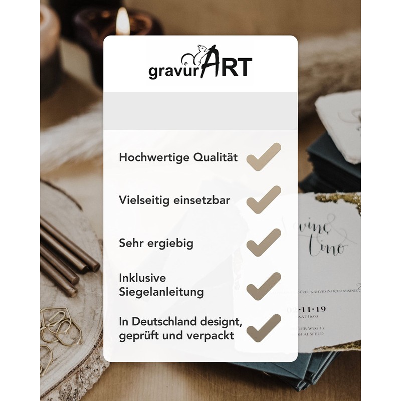 - Tested and packaged in Germany – proven for many years. Each bar seal stamp wax goes through our hands and is securely packaged. Tips for sealing are included in the practical sealing instructions.
