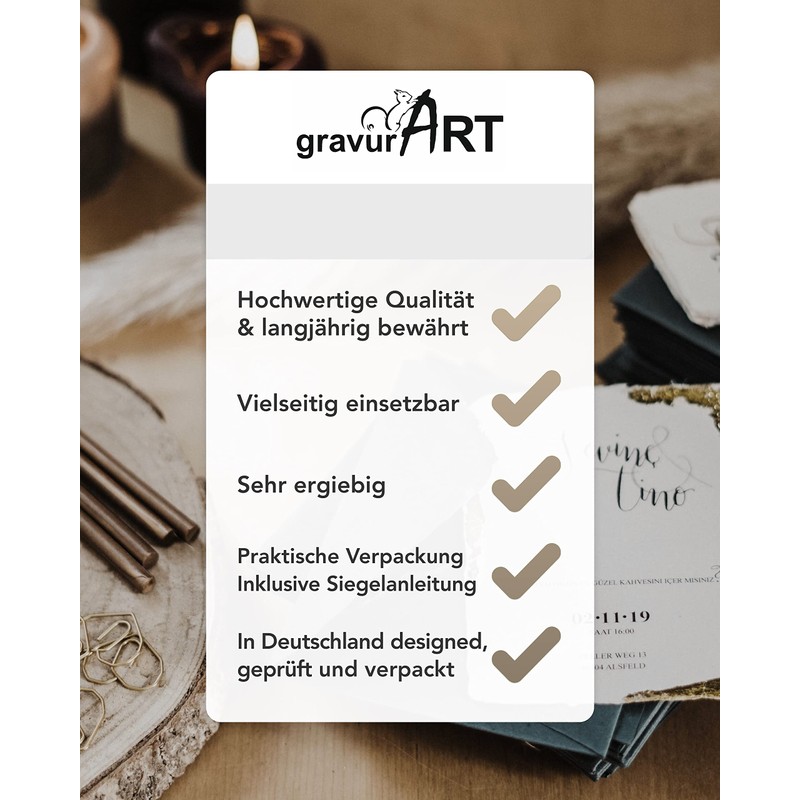 - Perfect embossing properties – for exact marks in the sealing wax without sticking the seal. Non-toxic and vegan. You can finish great wax seals with our gravurART seal stamps.