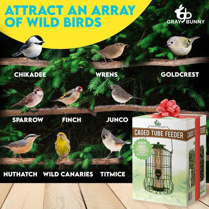 - The GrayBunny Caged Tube Feeder is great for attracting a variety of birds such as finches, chickadees, titmice, nuthatches, juncos and more!