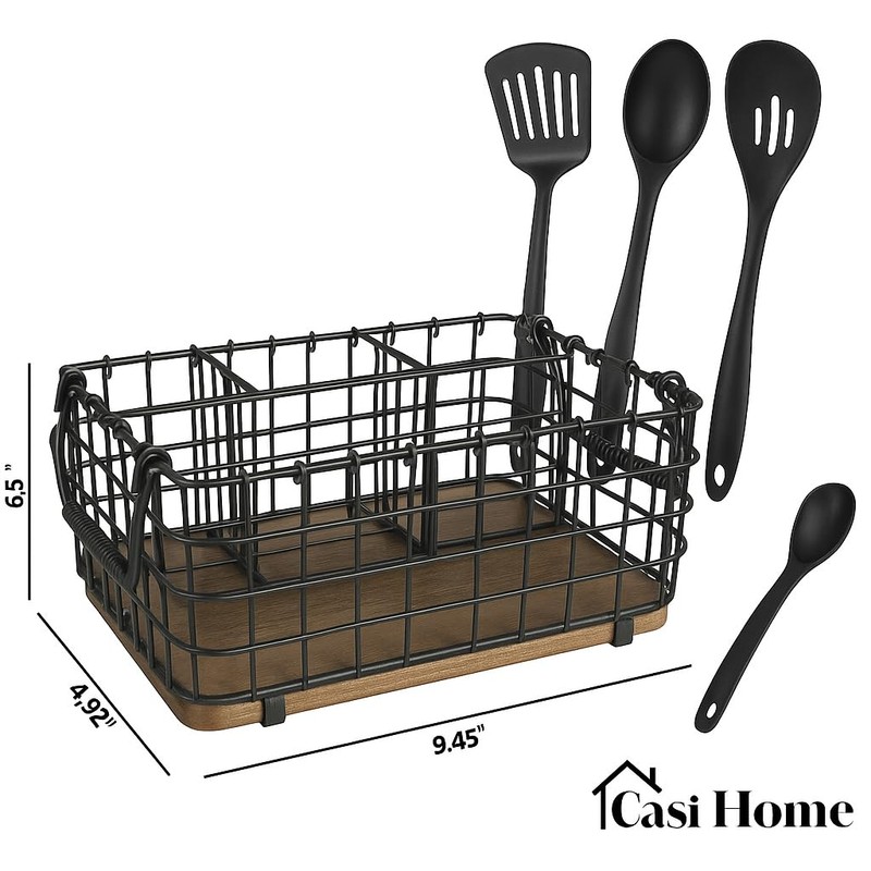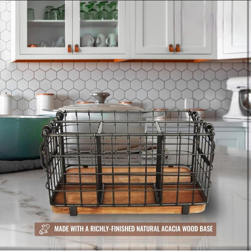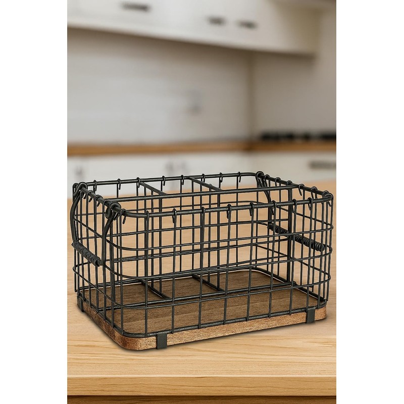 - Modern & Stylish Design – Sleek gray metal with a rustic wood base adds elegance to any kitchen or dining space 3 Spacious Compartments – Perfect for organizing cutlery, napkins, spatulas, and cooking tools Heavy-Duty & Durable – Crafted from premium carbon steel with a solid wood base for stability and long-term use Portable & Versatile – Built-in side handles make it easy to carry from kitchen to dining table or outdoor events Perfect Gift Idea – A thoughtful and practical gift for housewarmings, weddings, holidays, or hosts