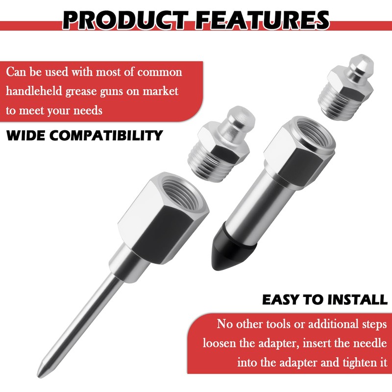 • Easy to Install: Grease injector needle kit is simple to use, no other tools or additional steps, loosen the adapter, insert the needle into the adapter and tighten it, disamantle the cap to lubrication, re-cap after use and dismantle the needle