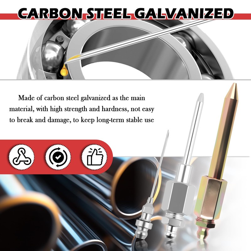 • High Strength: Needle grease fitting kit is made of carbon steel galvanized as the main material, with high strength and hardness, not easy to break and damage, adapted to the working environment of grease lubrication, to keep long-term stable use