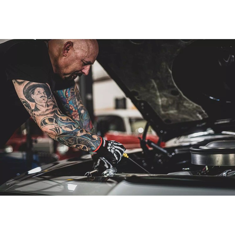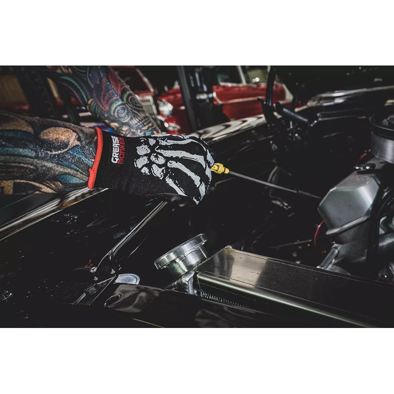 For most jobs around the house, yard or job site, this Grease Monkey nitrile dipped glove is a great solution. The nitrile-dipped palm and fingers provide an improved grip. The knit backing allows the glove to breathe and helps prevents debris from entering the wrist. Additionally, the latex-free nature of this glove allows it to be worn by those with latex allergies. Nitrile coated gloves are perfect for a variety of jobs. Extreme automotive / biker enthusiasts will love the skeleton themed pattern. These tough but flexible gloves provide premium grip with impact protection and include touchscreen capabilities.