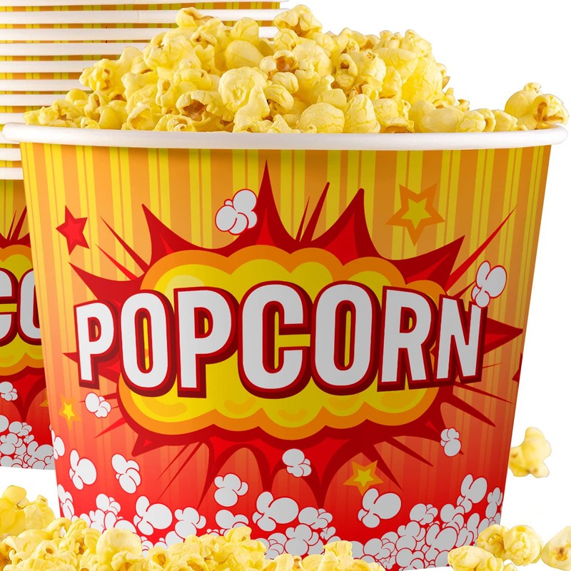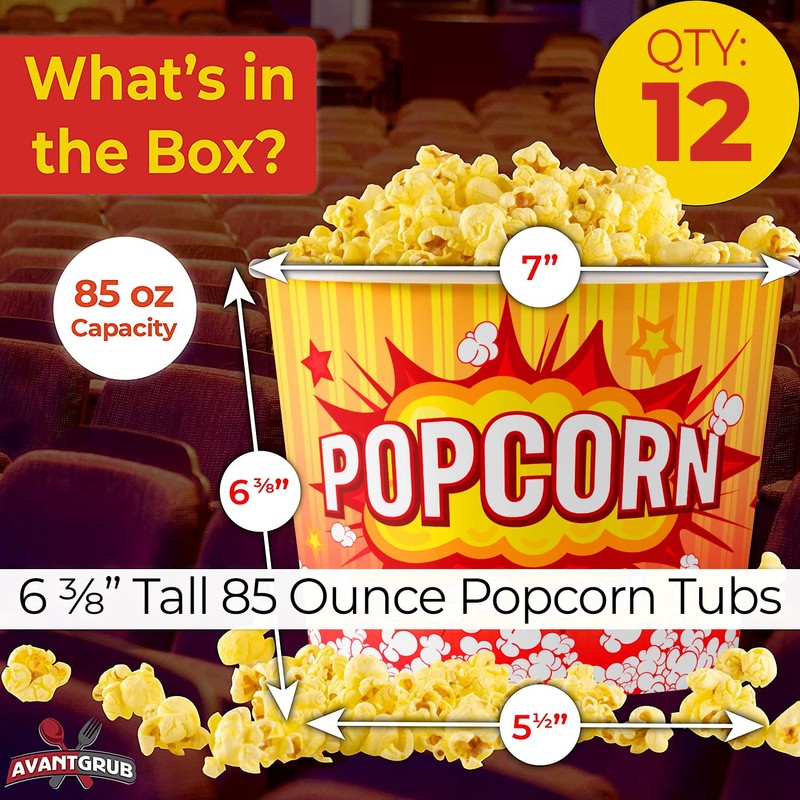 - LARGE SIZE TO LAST THROUGH A WHOLE MOVIE! Forget about running out of snacks in the worst moment. Our large 85 oz tubs hold enough corn to last until the end, and you will still have some left to share with your friends.