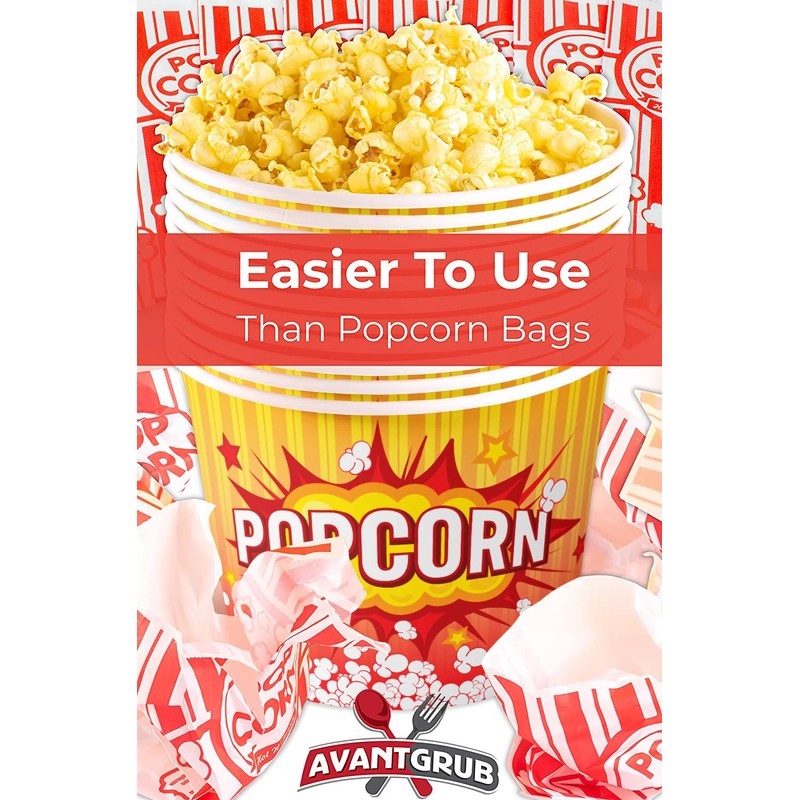 - FORGET STAINS AND MESS WITH PREMIUM QUALITY POPCORN PARTY SUPPLIES! Get all the fun with easier clean-up! Our coated paperboard popcorn buckets are grease proof to keep butter and oil from leaking out. Try them with French fries, fried chicken, BBQ wings, chips, and nachos!