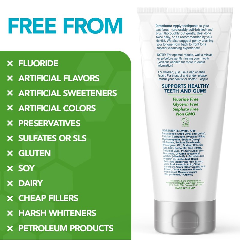 - POTENT INGREDIENTS: Our nano-hydroxyapatite toothpaste is packed with Xylitol for anti-cavity properties, organic aloe for natural healing, sea salt to tighten gums + is gluten, soy, dairy & glycerin free!* This sensitive toothpaste is also free of harsh whiteners, SLS, petroleum or animal products making it a vegan friendly toothpaste. *New production as of Jul 2024 is glycerin free however, please note you may still receive a unit with trace amounts of glycerin until our inventory is fully turned over.