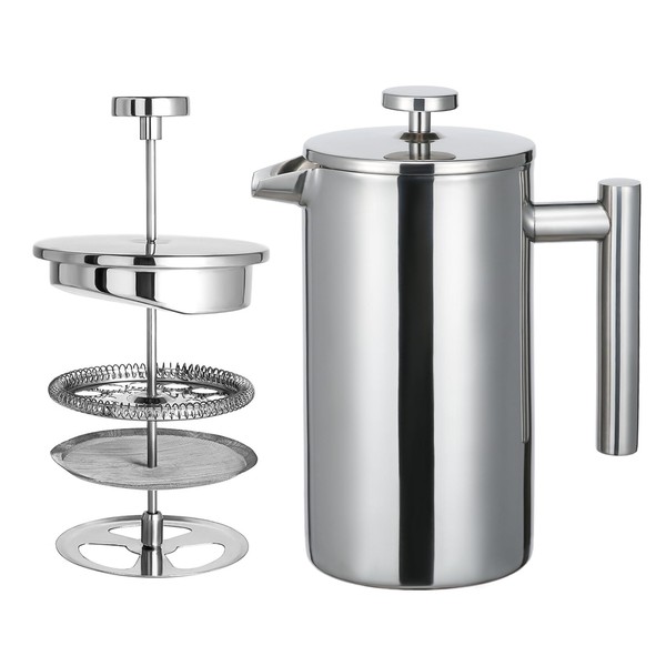 - DOUBLE WALL STAINLESS STEEL : The French Press coffee maker is made of stainless steel for both interior and exterior wall. 18/10 food-grade contact stainless steel, which has a smooth surface, is comfortable to grip, rust-resistant, durable, and has been carefully designed. Our coffee maker creates an elegant look with an exterior mirror finish and a brushed interior, a stylish design that never goes out of style.